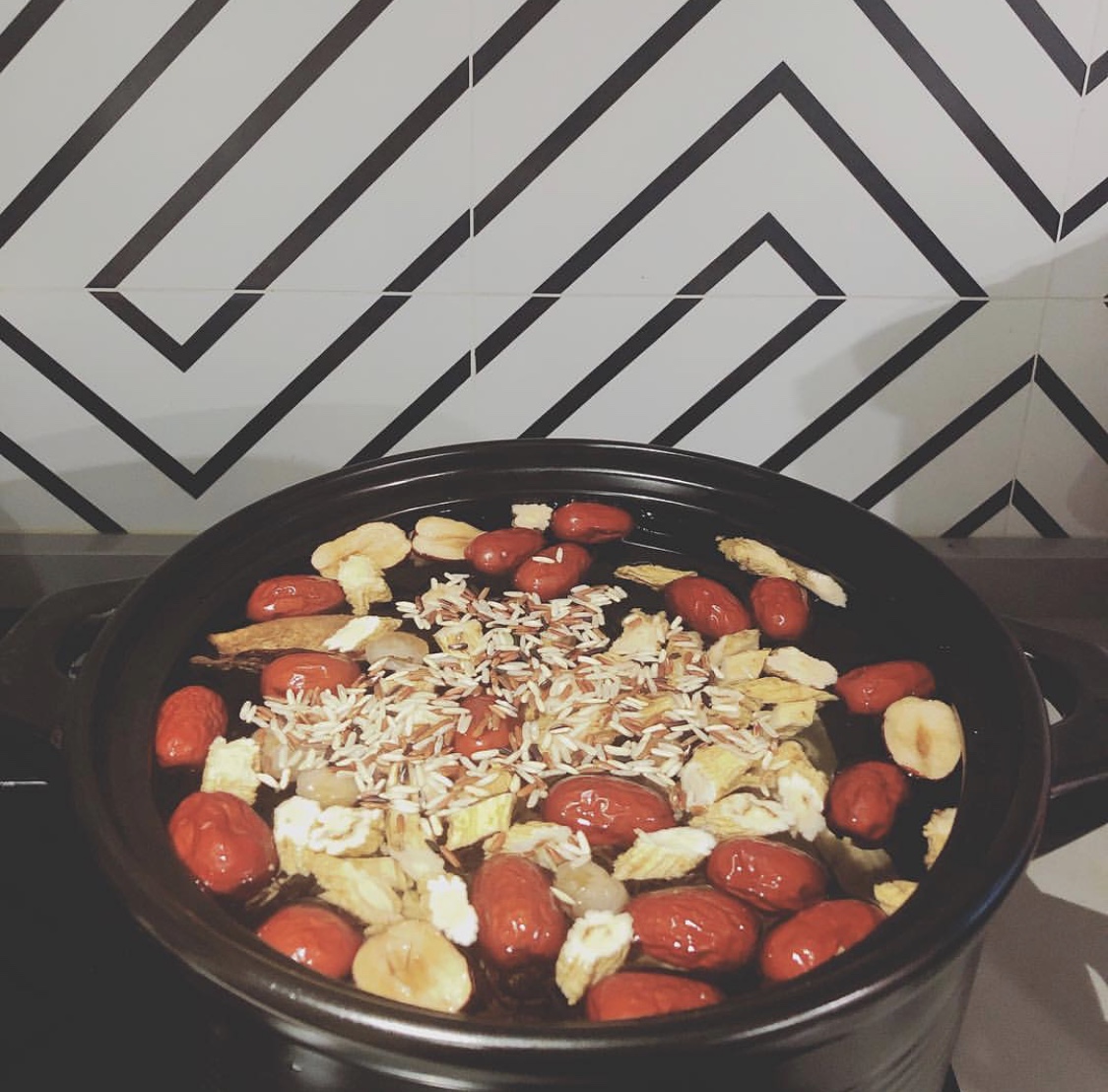 由於希望身體能好好恢復,除了吃小月餐,我還跟足正常產婦般每天煲薑水沖涼和預備炒米茶。坐小月期間,我以炒米茶代水飲,手術後一星期飲用的炒米茶材料以基本為主,只有炒米和陳皮,讓身體適應,慢慢恢復;第二星期在原有的炒米和陳皮中加入黨參、北芪、南棗,調補氣血;第三星期再進一步加入圓肉、紅棗和黑豆,作全面性調補,當中黑豆更有補腎功效。直至現在,每次月經後我都會有一天全日飲炒米茶呢,有時更會加入杜仲,補腎又補腰骨。