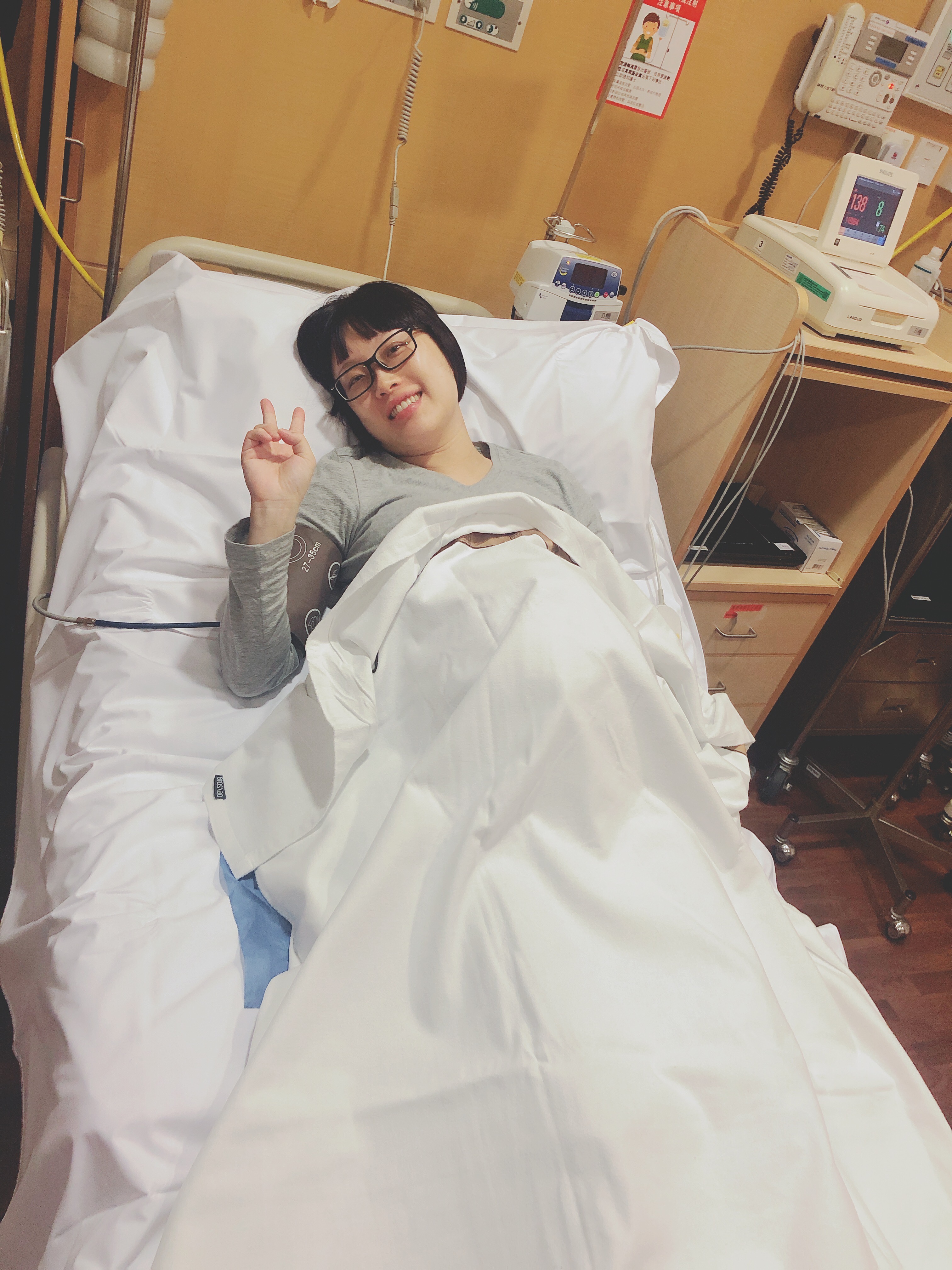 打完無痛好似係。。。凌晨3點幾咁,正當我以為可以抖下啦,阿仔成日係我肚郁來郁去,搞到check唔到心跳,姑娘要我轉來轉去搵返佢個心跳出嚟。無幾耐忽然見到阿仔心跳drop,無啦啦由130幾drop到80幾,然後忽然搵唔到,姑娘好驚,係我個肚面左探右探,然後一秒撲去打電話哪另一位姑娘來幫手,再塞隻手指入我下體抽插一陣(打咗無痛所以無覺得痛),總之就好似急救咁,然後同我講有機會緊急開刀,立即打俾醫生,我都未有時間驚,只答佢一句「好,BB安全就得。」,之後無啦啦阿仔個心跳又出現返,大家都鬆咗一口氣,然後姑娘話俾D補品我聞下,就駁咗條氧氣俾我。之前發生一系列嘅事真係電光火石之間,阿仔無事我先識得驚,心諗「第一胎已經無咗,好不容易有第二胎,陀到38週幾要生了,呢個時候先忽然無心跳?上帝你玩我嗎?」仲以為打完無痛有得抖,忽然搞單咁嘅嘢,我成晚就望住個心跳機,一路用念力希望阿仔心跳keep住130幾,有時無啦啦落返110幾我又會驚一下,又用念力推返佢上去,總之,就係成晚無瞓過,我老公都無得瞓,因為部心跳機唔係正對住我,我成日問老公阿仔心跳幾多?成晚講得最多就係問佢「而家心跳係幾多?」XDDDD (而家就笑得出)
